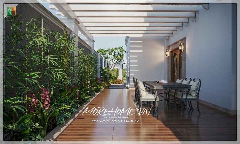 Thiết kế hiên nhà biệt thự thơ mộng với cây xanh và một bộ bàn ghế để gia chủ có thể tổ chức những bữa ăn ngoài trời thú vị