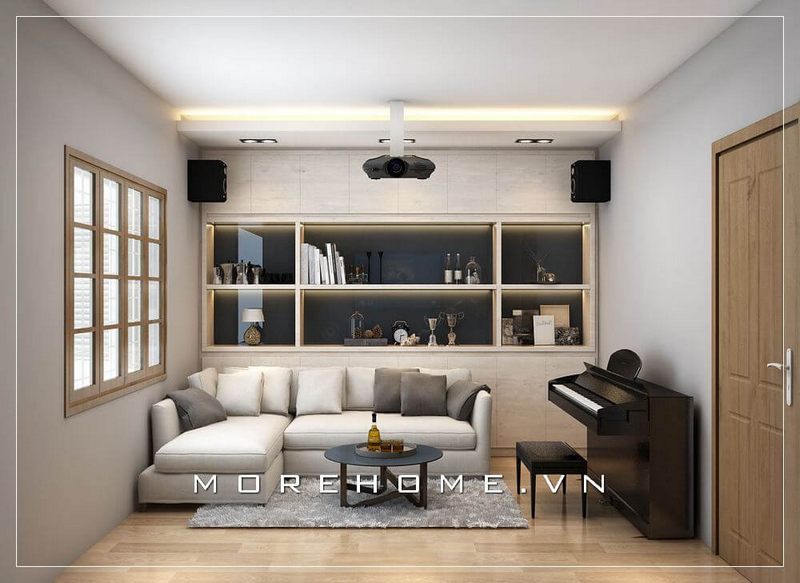 Mẫu kệ sách hiện đại, kết hợp với kệ trang trí gỗ công nghiệp, được thiết kế âm tường giúp tạo nên không gian rộng rãi, đang được nhiều gia chủ yêu thích và sử dụng.