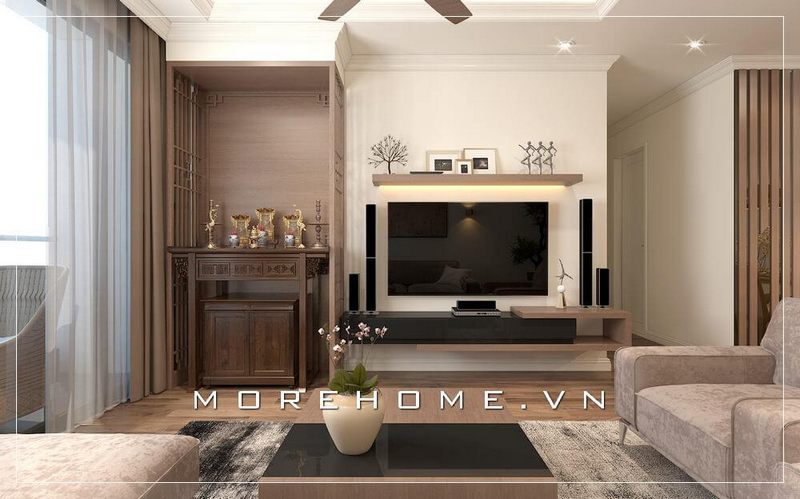 Mẫu thiết kế bàn thờ gỗ tự nhiên được ưa chuộng nhất hiện nay để trang trí phòng khách chung cư.