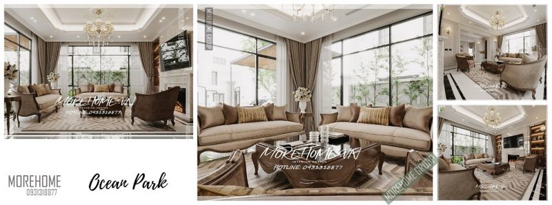 Thiết kế phòng khách theo phong cách tân cổ điển với nội thất gỗ óc chó tự nhiên bọc bởi nỉ Bỉ cao cấp.