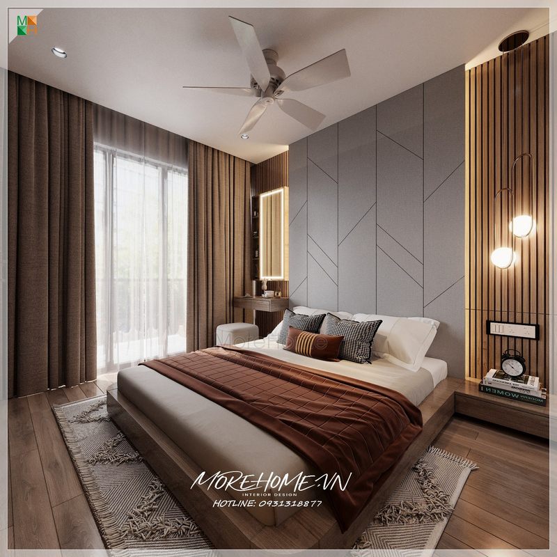 . Phòng ngủ có thiết kế sàn gỗ công nghiệp với gam màu đồng điệu và nội thất giúp căn phòng trở nên thoáng đãng hơn.